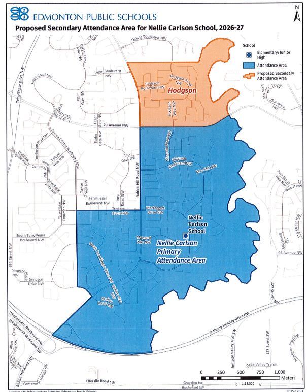 This enrollment prioritization will occur after all resident students from the primary attendance area (MacTaggart, Magrath and Terwillegar Southeast) have been accommodated. However, this will not guarantee access to Nellie Carlson School. Resident students residing in Hodgson will continue to have access to their designated schools: Brander Gardens (K–6) and Riverbend (7–9).